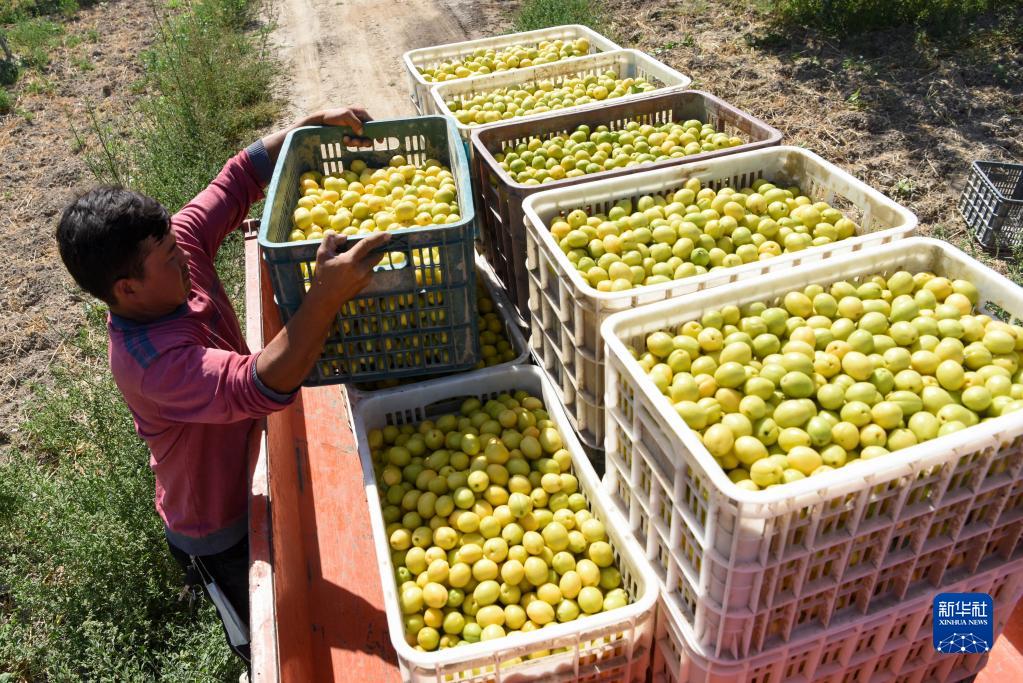 在新疆阿克蘇地區(qū)庫車市齊滿鎮(zhèn)齊滿村,農(nóng)戶將采摘的小白杏裝車(2021年7月1日攝)。新華社記者 丁磊 攝