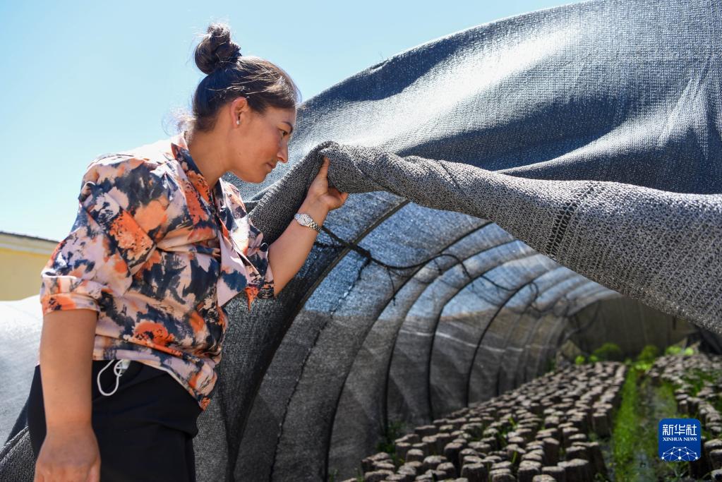 在新疆烏什縣依麻木鎮(zhèn),在新疆維吾爾自治區(qū)黨委組織部、老干部局駐托萬克麥蓋提村“訪民情惠民生聚民心”工作隊(duì)的幫助下,不少村民通過培植木耳增收致富(2022年6月7日攝)。新華社記者 丁磊 攝