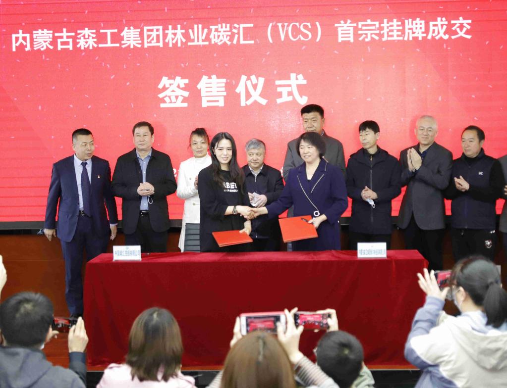 2021年4月8日,內蒙古森工集團林業(yè)碳匯(VCS)首宗掛牌成交簽售儀式在內蒙古產(chǎn)權交易中心完成。(受訪單位供圖)