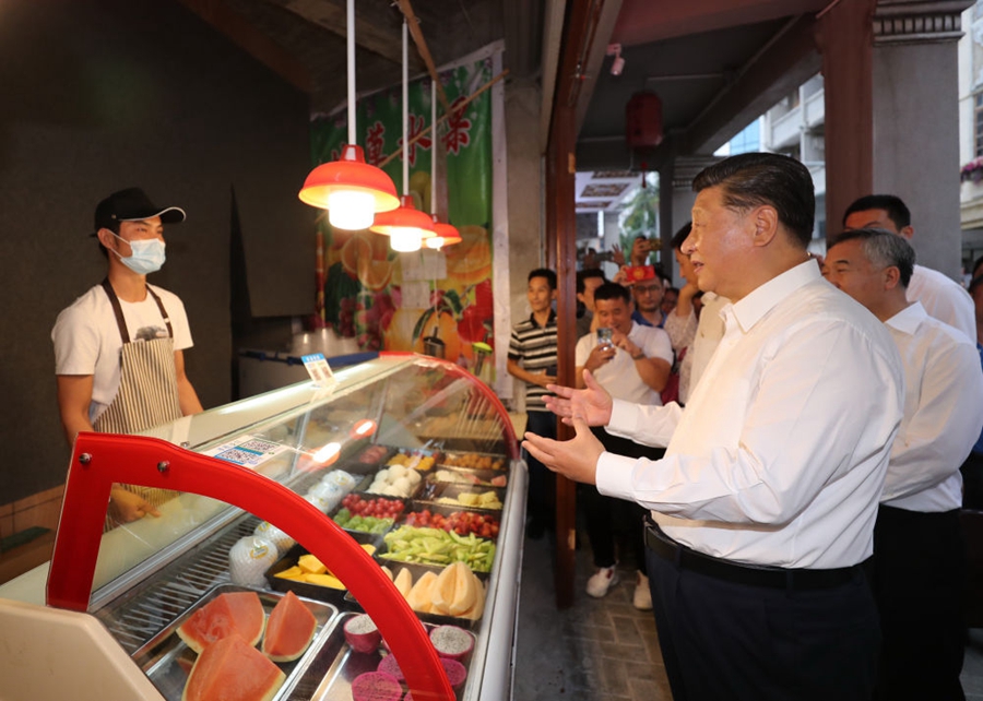 ↑2020年10月12日至13日,習近平在廣東考察。這是13日下午,習近平在汕頭市小公園開埠區(qū),同商鋪店員親切交流,了解復商復市和常態(tài)化疫情防控情況。