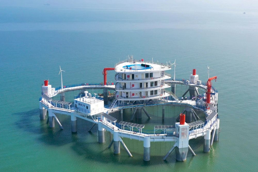 ↑“耕海1號”海洋牧場綜合體平臺位于山東省煙臺市漁人碼頭以東海域,是我國首座大型智能化海洋牧場綜合體平臺,于2020年7月投運,每年可養(yǎng)殖優(yōu)質海水魚類20萬尾,年產(chǎn)量約15萬公斤(2020年7月10日攝)。