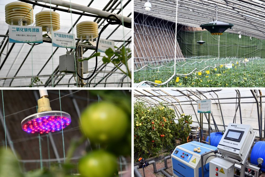 ↑這是在山東省壽光市現(xiàn)代農(nóng)業(yè)高新技術試驗示范基地拍攝的AI智慧大棚內(nèi)景。左上為傳感器設備;右上為多功能植保機;左下為補光燈;右下為電動噴淋機(2020年4月21日攝)。