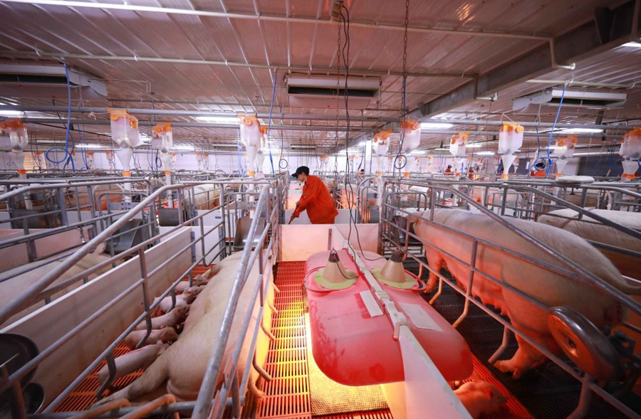 ↑在貴州省銅仁市玉屏侗族自治縣朱家場鎮(zhèn)一家仔豬繁殖場,管理員在清掃豬舍(2018年3月23日攝)。