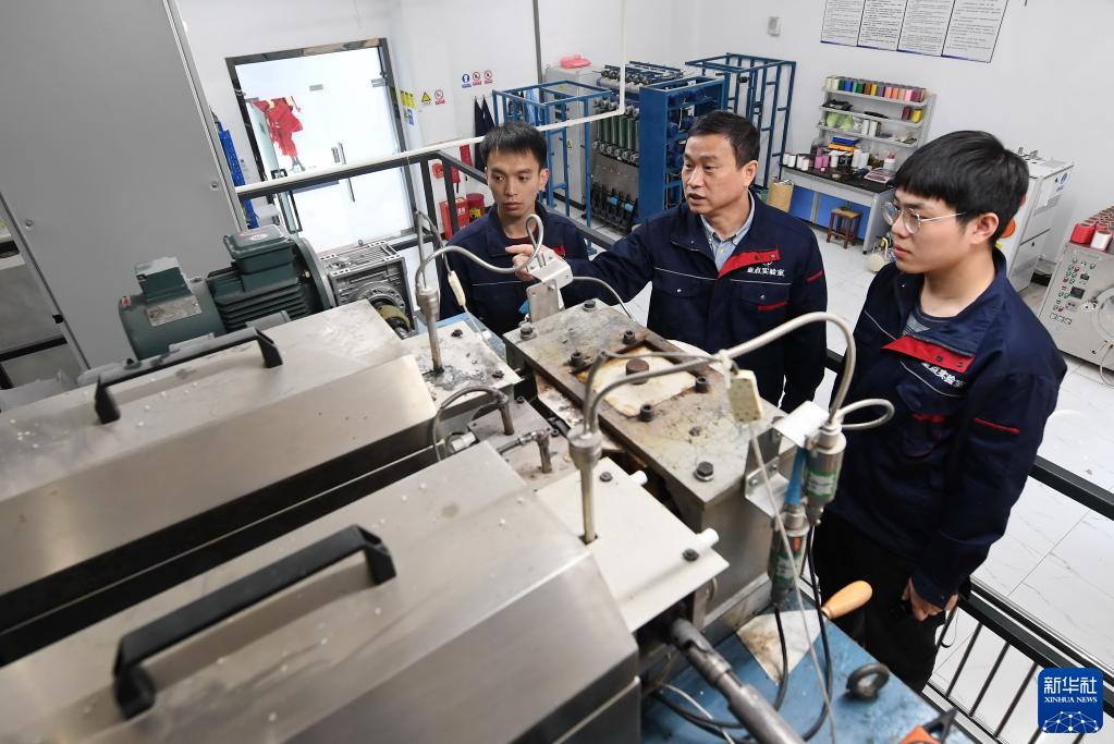 福建閩江學(xué)院服裝與藝術(shù)工程學(xué)院教授李永貴(中)在“福建省新型功能性紡織纖維及材料重點實驗室”教學(xué)生做紡絲實驗(2021年3月22日攝)。新華社記者 林善傳 攝