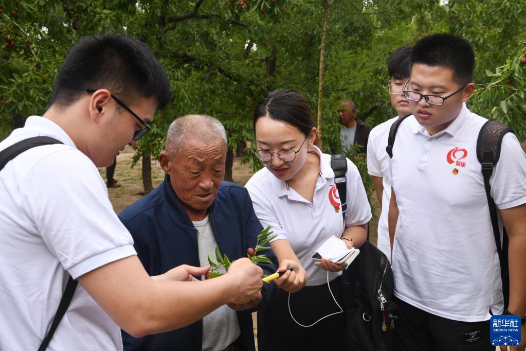 中國海洋大學(xué)紅旗智援博士團成員在山東省樂陵市朱集鎮(zhèn)大常村棗林向果農(nóng)了解果樹種植情況(2019年9月19日攝)。新華社記者 李紫恒 攝