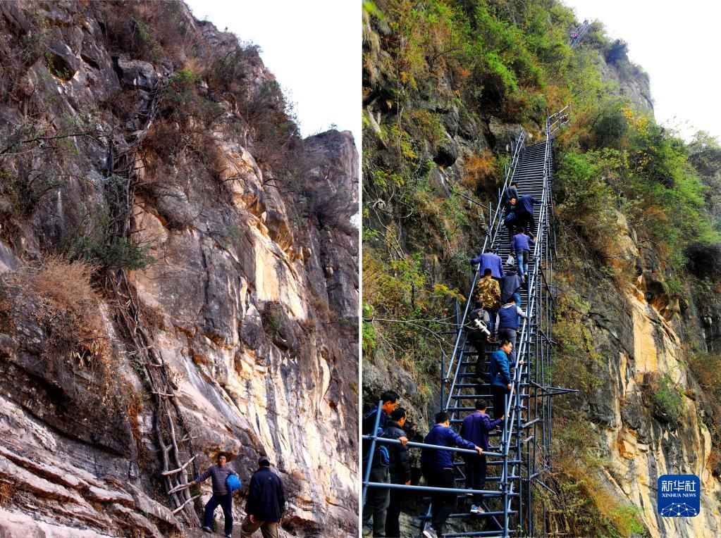 拼版照片:左圖為2013年2月22日拍攝的四川省涼山彝族自治州昭覺縣“懸崖村”阿土勒爾村的藤梯;右圖為2016年11月29日,在四川省涼山彝族自治州昭覺縣,人們沿著剛建好的鋼梯登上“懸崖村”。新華社發(fā)(阿克鳩射 攝)