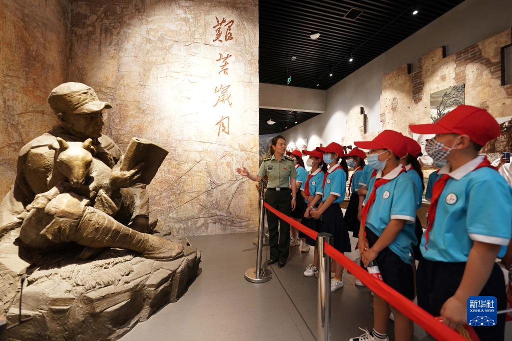 2021年5月30日,在位于河北省邢臺市信都區(qū)漿水鎮(zhèn)的中國人民抗日軍政大學(xué)陳列館,工作人員向小學(xué)生們講述抗大歷史。新華社記者 牟宇 攝