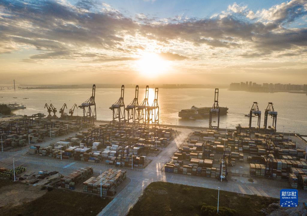 這是2021年12月5日清晨在海南自貿(mào)港重點(diǎn)園區(qū)洋浦經(jīng)濟(jì)開發(fā)區(qū)拍攝的洋浦國際集裝箱碼頭(無人機(jī)照片)。新華社記者 蒲曉旭 攝
