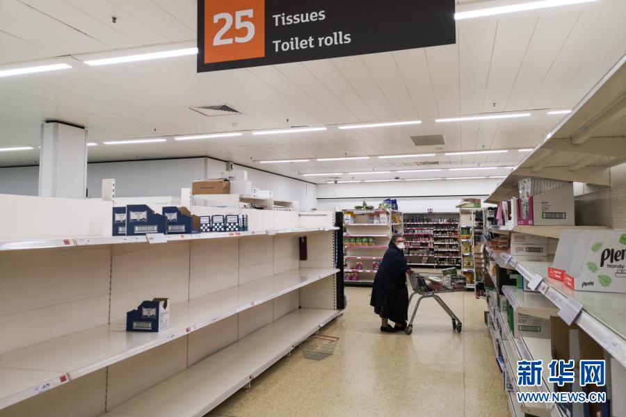 2020年3月20日,在英國倫敦的一家超市,一名女士從空蕩的貨架旁走過。新華社發(fā)(喬·紐曼攝)