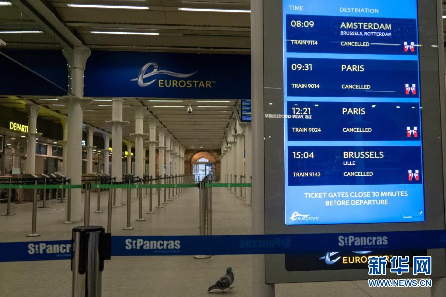 2020年12月21日,英國倫敦圣潘克拉斯火車站國際出發(fā)大廳內(nèi)顯示,多趟“歐洲之星”列車被取消。新華社發(fā)(蒂姆·愛爾蘭攝)