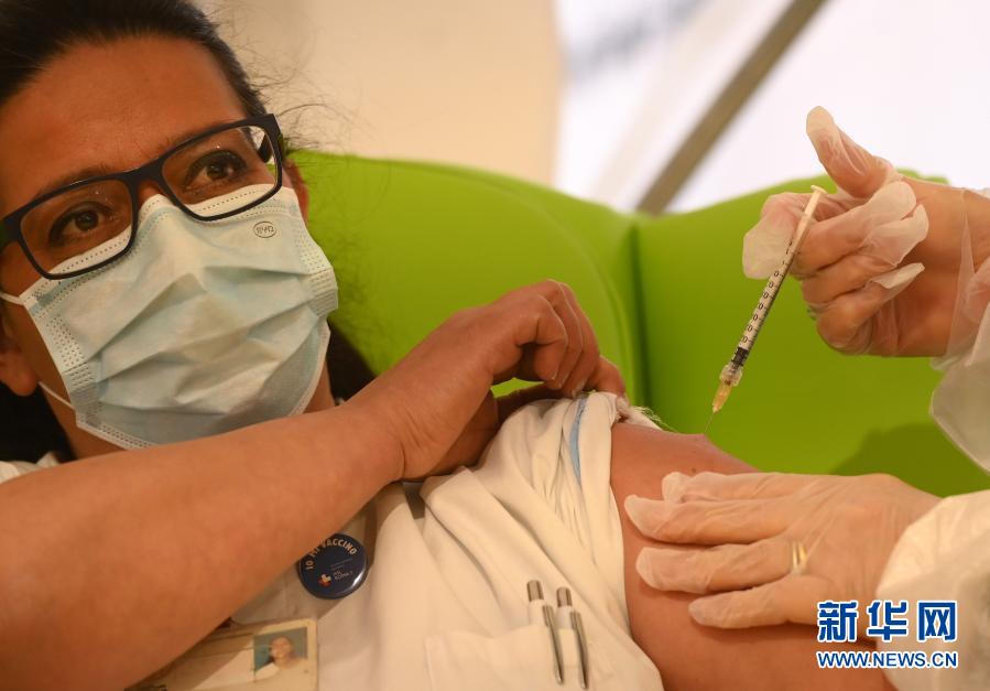 2020年12月28日,在意大利羅馬一家醫(yī)院,一名醫(yī)護人員接種由美國輝瑞制藥有限公司與德國生物新技術(shù)公司聯(lián)合研發(fā)的新冠疫苗。新華社發(fā)(阿爾貝托·林格利亞攝)