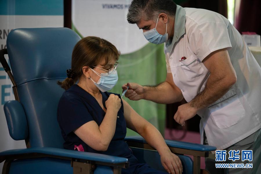 2020年12月29日,在阿根廷布宜諾斯艾利斯省阿維亞內(nèi)達,一名醫(yī)務(wù)人員接種由俄羅斯研發(fā)的“衛(wèi)星V”疫苗。新華社發(fā)(馬丁·薩巴拉攝)