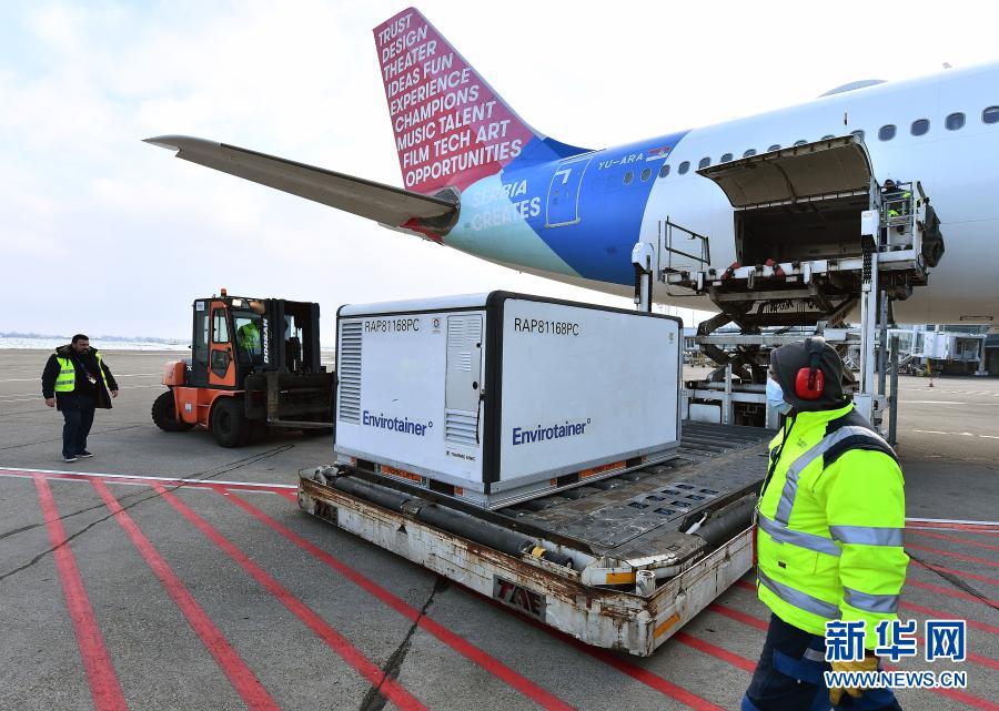 2021年1月16日,在塞爾維亞首都貝爾格萊德,機場工作人員卸載首批由中國國藥集團生產(chǎn)的新冠疫苗。新華社發(fā)(普雷德拉格·米洛薩夫列維奇攝)