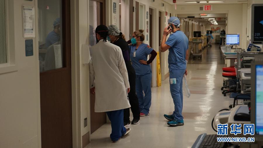 2021年1月22日,在美國加利福尼亞州蒙特貝洛市貝弗利醫(yī)院,醫(yī)護人員在“新冠病區(qū)”工作。由于新冠確診病例激增,南加州地區(qū)醫(yī)院的重癥監(jiān)護室空置率為零。新華社發(fā)(曾慧攝)