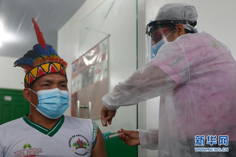 2021年1月19日,在巴西亞馬孫州塔巴廷加市,醫(yī)護人員為一名原住民接種中國新冠疫苗。新華社發(fā)(盧西奧·塔沃拉 攝)