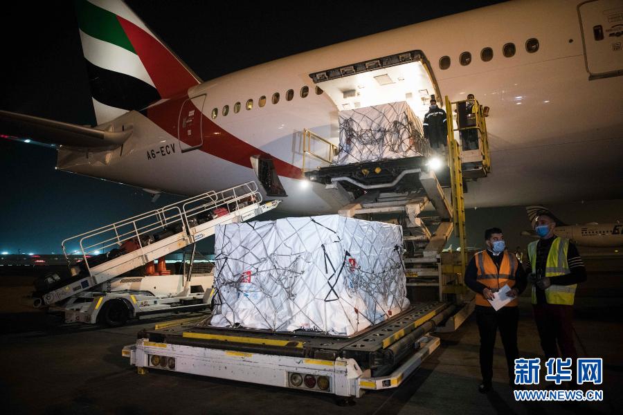 2020年12月10日,在埃及開羅國際機場,工作人員運輸中國研制生產(chǎn)的新冠疫苗。新華社記者鄔惠我攝