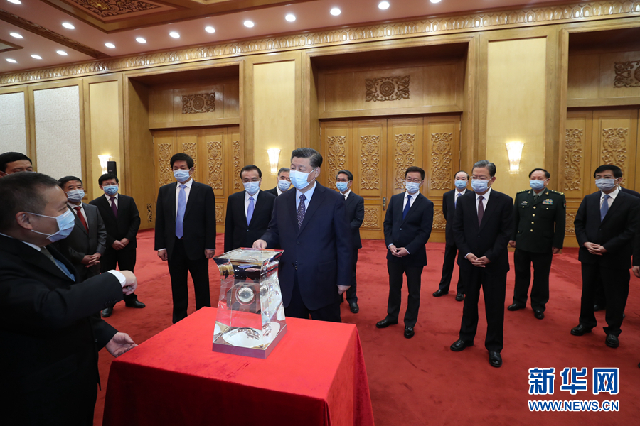 2月22日,黨和國家領(lǐng)導(dǎo)人習(xí)近平、李克強、栗戰(zhàn)書、汪洋、王滬寧、趙樂際、韓正等在北京人民大會堂會見探月工程嫦娥五號任務(wù)參研參試人員代表并參觀月球樣品和探月工程成果展覽。這是習(xí)近平等會見探月工程嫦娥五號任務(wù)參研參試人員代表。新華社記者 王曄 攝