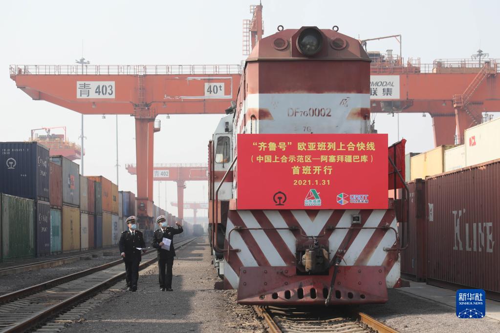 膠州海關(guān)關(guān)員對“齊魯號”歐亞班列上合快線(中國上合示范區(qū)——阿塞拜疆巴庫)線路首班列車進行檢查(2021年1月31日攝)。新華社發(fā)(解豪 攝)