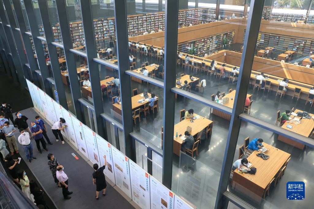 在北京國(guó)家圖書(shū)館,工作人員在介紹“經(jīng)典,予生活以詩(shī)意——‘文津經(jīng)典誦讀’十周年主題展”(2022年9月7日攝)。新華社記者 殷剛 攝
