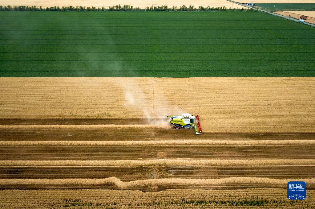 聯(lián)合收割機(jī)在新疆昌吉回族自治州奇臺(tái)縣大泉塔塔爾民族鄉(xiāng)的麥田里收割小麥(2022年7月7日攝,無人機(jī)照片)。新華社記者 張嘯誠(chéng) 攝