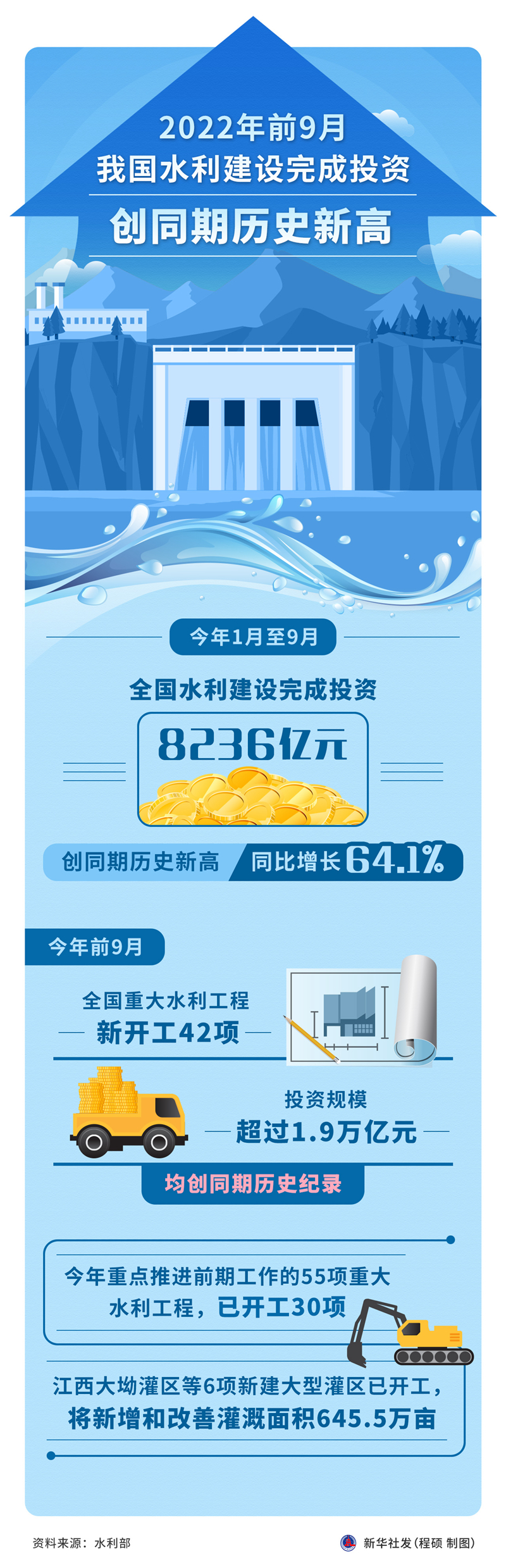 據(jù)水利部統(tǒng)計(jì),今年前9月水利建設(shè)落實(shí)投資、完成投資為歷史同期最多:落實(shí)水利建設(shè)投資10571億元,同比增長53%;完成水利建設(shè)投資8236億元,同比增長64.1%。