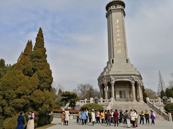 2021年3月18日,小小紅色講解員在位于烈士陵園中央的革命烈士紀(jì)念塔前,學(xué)生們在學(xué)習(xí)講解知識(shí)的同時(shí)也接受紅色教育。新華社記者楊文 攝