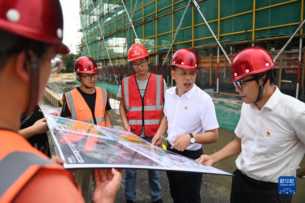 在浙江省寧波市奉化區(qū)蕭王廟街道滕頭村,二十大代表、滕頭村黨委書記、村委會(huì)主任傅平均(右二)在村黨群服務(wù)中心大樓建設(shè)工地察看施工進(jìn)展(2022年9月16日攝)。新華社記者 黃宗治 攝