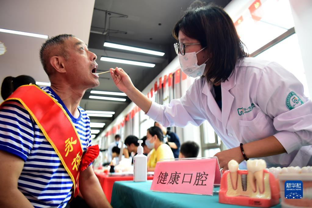 安徽省合肥市蜀山區(qū)洪崗社區(qū)志愿者為市民檢查口腔(2022年7月29日攝)。新華社記者 黃博涵 攝
