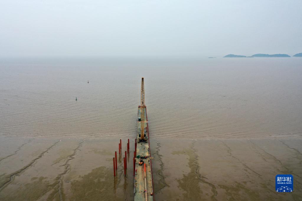 工程人員在通蘇嘉甬高鐵杭州灣跨海鐵路大橋施工現(xiàn)場鋪設棧橋,為后期工程做準備(2023年2月1日攝,無人機照片)。2022年11月30日開工建設的通蘇嘉甬高鐵杭州灣跨海鐵路大橋全程跨海,總長約29.2公里,為設計時速350公里的雙線高速鐵路橋,是目前世界上在建長度最長、建設標準最高的高速鐵路跨海大橋。新華社記者 黃宗治 攝