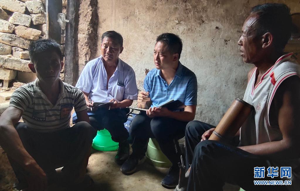 記者何偉(右一)與同事采訪廣西百色市樂(lè)業(yè)縣百坭村新任駐村第一書(shū)記楊杰興(中)(2019年7月31日攝)。新華社記者 徐海濤 攝