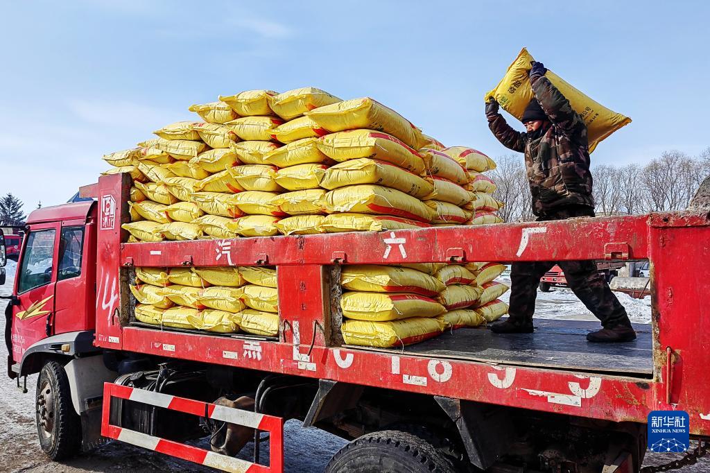北大荒集團五大連池農(nóng)場科技服務中心工人在裝運肥料(2月16日攝)。新華社發(fā)(陸文祥 攝)