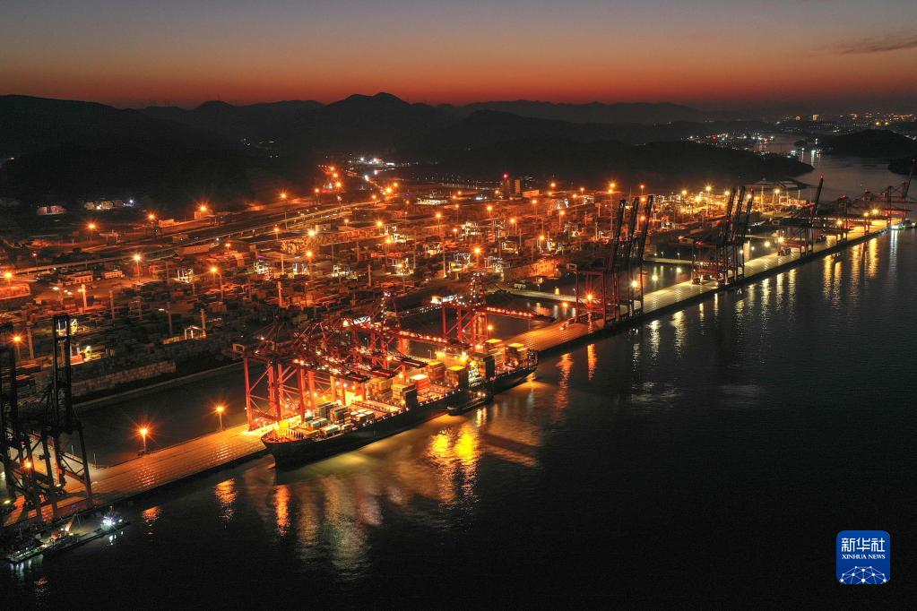 夜幕下,一艘貨輪??吭趯幉ㄖ凵礁鄞┥礁蹍^(qū)集裝箱碼頭(1月31日攝,無人機照片)。新華社記者 黃宗治 攝