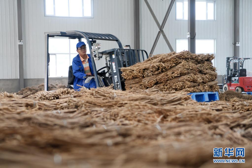 在甘肅省隴南市宕昌縣哈達(dá)鋪琦昆現(xiàn)代中藥材倉儲物流基地,工作人員使用叉車搬運(yùn)中藥材(2020年9月18日攝)。新華社記者 范培珅 攝