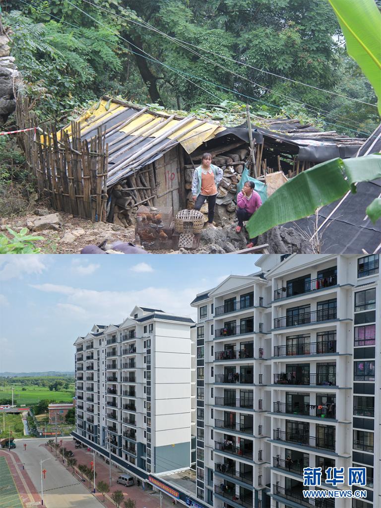 這是一張拼版照片,上圖為:2018年11月11日在廣西田東縣思林鎮(zhèn)龍邦村拍攝的村民和自家簡陋的房屋(思林鎮(zhèn)政府供圖);下圖為:2019年8月28日拍攝的當(dāng)?shù)貫辇埌畲逍陆ǖ奈挥谔飽|縣思林鎮(zhèn)的易地扶貧搬遷安置點(diǎn)(無人機(jī)照片,新華社記者曹祎銘攝)。新華社發(fā)