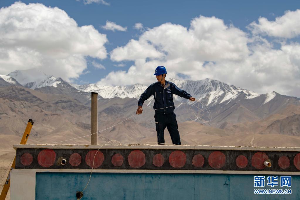 在新疆喀什地區(qū)塔什庫爾干塔吉克自治縣,工作人員為當(dāng)?shù)剞r(nóng)戶鋪設(shè)入戶光纖(2020年6月10日攝)。新華社記者 胡虎虎 攝