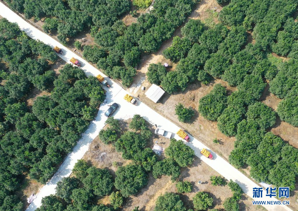 在廣西羅城仫佬族自治縣金玉柚生態(tài)產(chǎn)業(yè)扶貧示范區(qū),裝載柚子的車輛在柚子園內(nèi)行駛(2019年11月5日攝,無人機(jī)照片)。新華社記者 陸波岸 攝