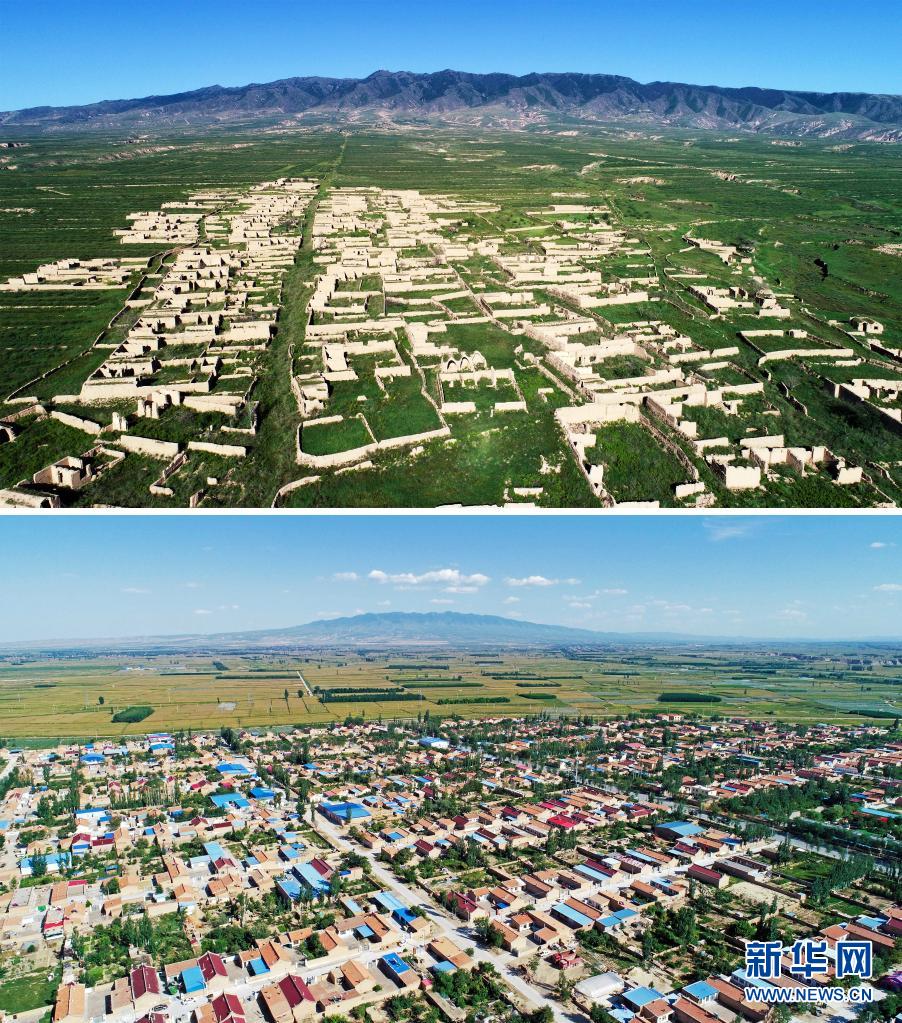 這是一張拼版照片,上圖為:經(jīng)過多年的生態(tài)修復(fù),寧夏吳忠市紅寺堡區(qū)新莊集鄉(xiāng)的移民舊址已逐漸被綠色覆蓋;下圖為:戈壁荒灘上建起的紅寺堡移民新村(2018年9月8日攝,無人機(jī)照片)。新華社記者 王鵬 攝