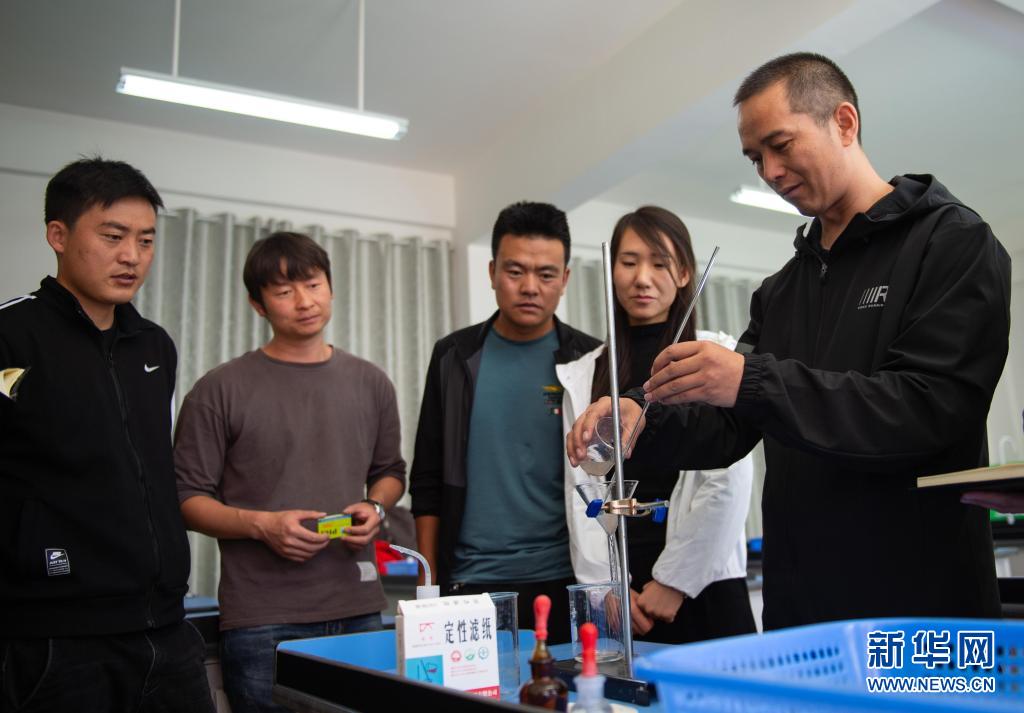 北京市援青支教教師、來自通州區(qū)陸辛莊學(xué)校的化學(xué)教師祁生貴(右一)在青海省玉樹州第四民族高級中學(xué)指導(dǎo)學(xué)校教師進(jìn)行實(shí)驗(yàn)教學(xué)(2020年8月12日攝)。新華社記者 陳鐘昊 攝