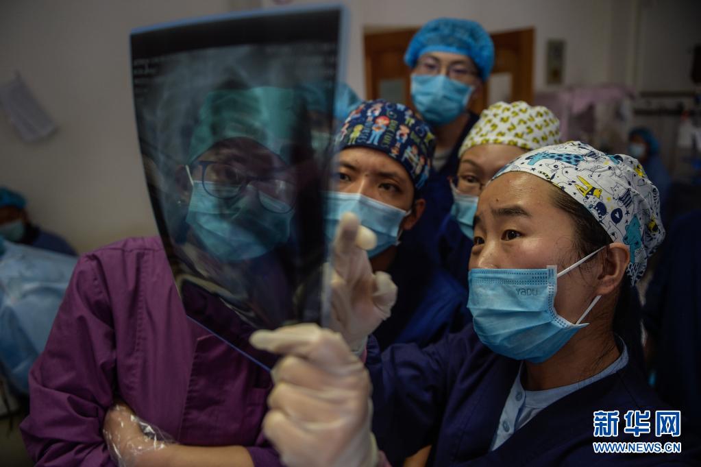 在西藏拉薩市人民醫(yī)院內(nèi),首都兒科研究所的援藏醫(yī)生韓同英(右一)進(jìn)行教學(xué)查房時,與當(dāng)?shù)蒯t(yī)生們一起研究入院新生兒胸片(2020年8月3日攝)。新華社記者 彭子洋 攝