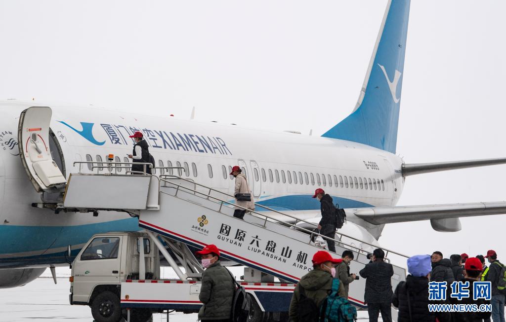 在寧夏固原六盤山機(jī)場,固原市原州區(qū)、西吉縣的務(wù)工人員乘包機(jī)前往福建(2020年2月27日攝)。新華社記者 馮開華 攝