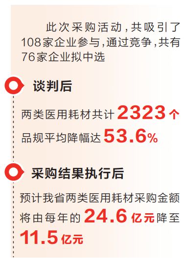此次采購(gòu)活動(dòng),共吸引了108家企業(yè)參與,其中,國(guó)內(nèi)企業(yè)70家、外資企業(yè)38家。通過(guò)前期充分調(diào)研,會(huì)中集中開(kāi)標(biāo)、兩輪談判等公平競(jìng)爭(zhēng)環(huán)節(jié),共有76家企業(yè)擬中選。談判后,兩類(lèi)醫(yī)用耗材共計(jì)2323個(gè)品規(guī)平均降幅達(dá)53.6%。采購(gòu)結(jié)果執(zhí)行后,預(yù)計(jì)我省兩類(lèi)醫(yī)用耗材采購(gòu)金額將由每年的24.6億元降至11.5億元。