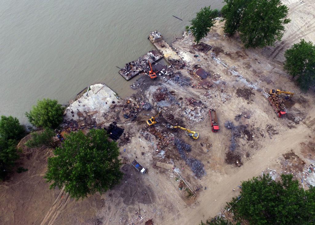 2016年5月18日,工作人員在武漢余家頭非法碼頭整治清理現(xiàn)場(chǎng)進(jìn)行收尾工作。新華社記者 程敏 攝