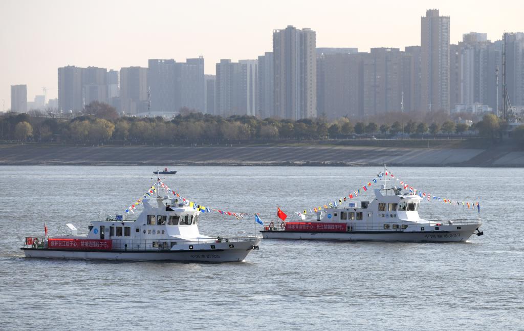 漁政執(zhí)法船隊(duì)從長(zhǎng)江武漢段江面駛過(guò)(2020年12月31日攝)。新華社記者 程敏 攝