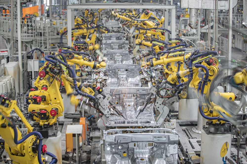 3月1日,在長城汽車重慶永川生產(chǎn)基地焊裝車間,智能化焊接機器人在進行焊接作業(yè)。新華社記者 黃偉 攝