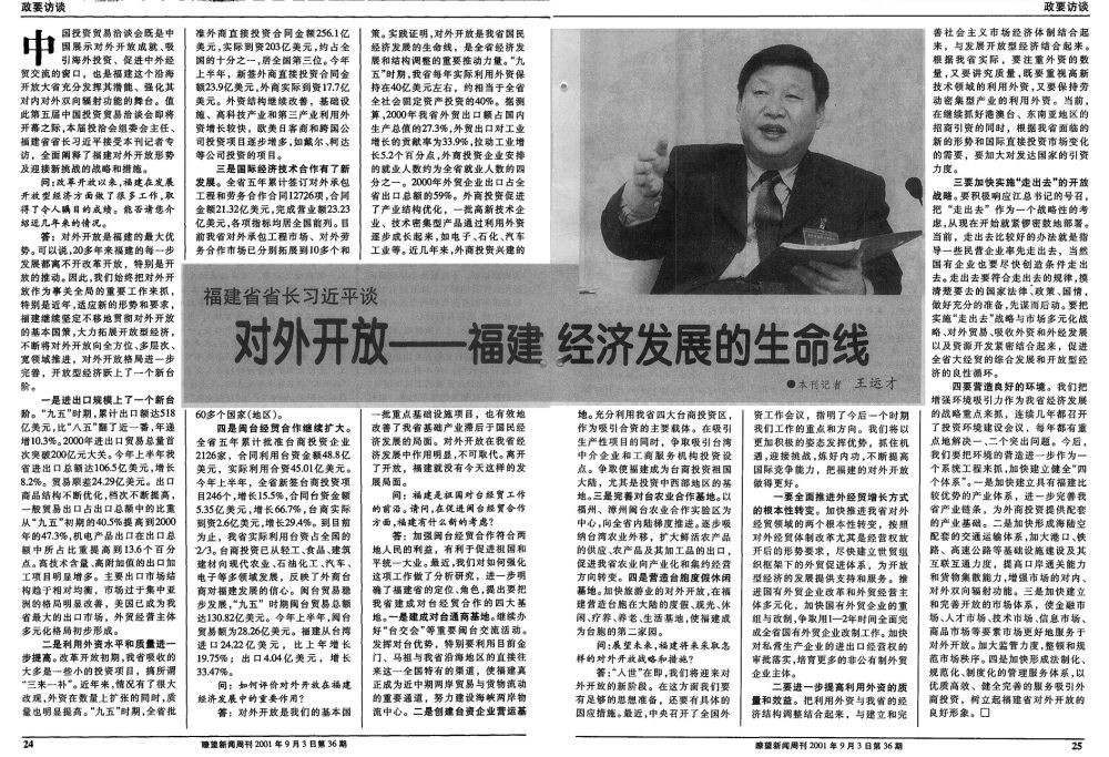 這篇獨家專訪很快以《構(gòu)建對外開放的戰(zhàn)略通道——福建省省長習近平談:山海協(xié)作,對內(nèi)聯(lián)接,對外開放》為題,在《瞭望》2002年第41期刊發(fā),海內(nèi)外媒體大量轉(zhuǎn)載,產(chǎn)生了重大社會影響。