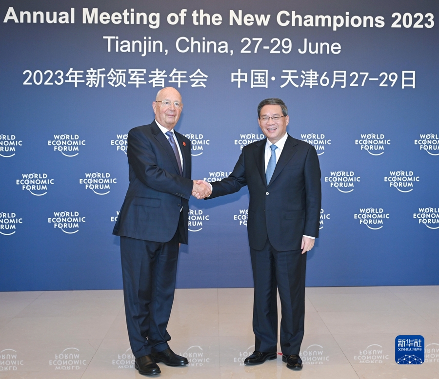 6月26日下午,國(guó)務(wù)院總理李強(qiáng)在天津會(huì)見世界經(jīng)濟(jì)論壇主席施瓦布。新華社記者 岳月偉 攝