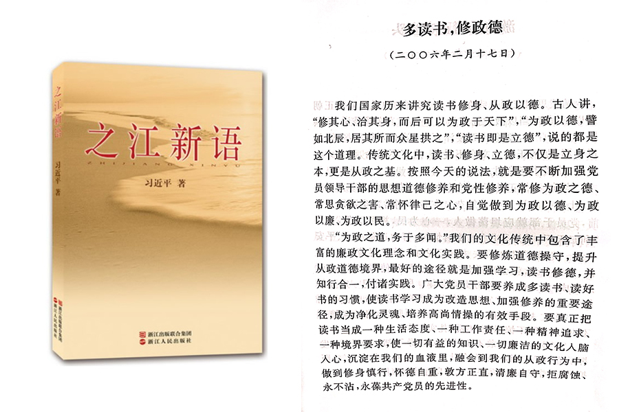 2006年2月17日,時任浙江省委書記的習(xí)近平用筆名“哲欣”在《浙江日報》“之江新語”專欄發(fā)表題為《多讀書,修政德》的文章。他說,我們國家歷來講究讀書修身、從政以德。廣大黨員干部要養(yǎng)成多讀書、讀好書的習(xí)慣,使讀書學(xué)習(xí)成為改造思想、加強修養(yǎng)的重要途徑,成為凈化靈魂、培養(yǎng)高尚情操的有效手段。