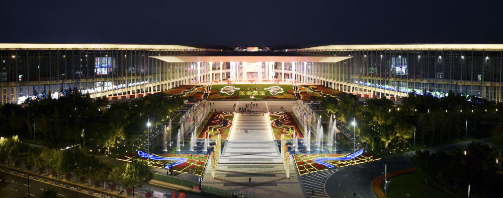 2022年11月5日至10日,第五屆中國國際進口博覽會在國家會展中心(上海)舉行。這是11月5日拍攝的國家會展中心(上海)夜景。新華社記者 劉穎 攝