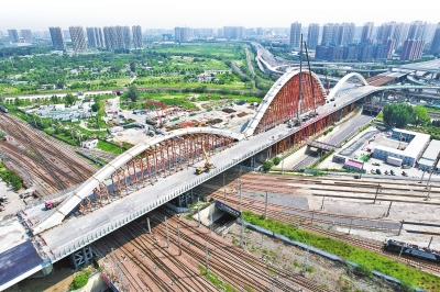 (圖/本報(bào)記者 王錚 攝) ??7月18日,隨著合龍指令的發(fā)出,鄭州新建彩虹橋主橋中跨最后一節(jié)鋼箱拱緩緩放落,橋梁的“彩虹”輪廓初現(xiàn)芳容。 ??“這節(jié)鋼箱拱長8.4米、寬8米、高2米?!背薪ǚ街需F大橋局彩虹橋項(xiàng)目相關(guān)負(fù)責(zé)人表示,至此,新建彩虹橋的鋼箱拱全部安裝完畢,標(biāo)志著大橋主體結(jié)構(gòu)即將完工,為實(shí)現(xiàn)按期通車目標(biāo)奠定了堅(jiān)實(shí)基礎(chǔ)。 ??被稱為“彩虹橋”的鄭州北環(huán)快速路鐵路跨線大橋,是鄭州北區(qū)東西向的咽喉要道,1994年年底建成通車,由于近年來交通量逐年增大,橋梁通行壓力較大,該橋經(jīng)過多次整修仍無法滿足市民出行需求,2019年拆除重建。 ??據(jù)介紹,鄭州新建彩虹橋上部結(jié)構(gòu)為下承式三跨連續(xù)單拱肋鋼箱系桿拱橋,重2000多噸。預(yù)計(jì)新橋建成后,將大大緩解北三環(huán)東西向的交通壓力,對(duì)于完善鄭州的快速路網(wǎng)結(jié)構(gòu),加強(qiáng)中心城區(qū)與周邊區(qū)域的聯(lián)系等具有重要意義。(記者 李林)