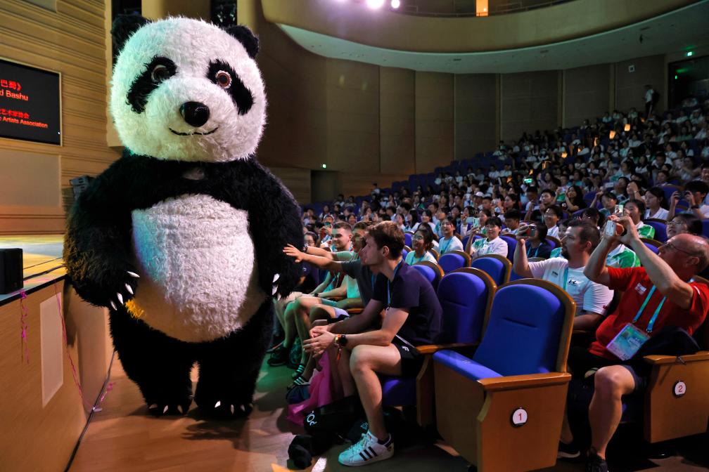 8月2日,一名演員裝扮成大熊貓在演出間隙與觀眾互動。當(dāng)日,“奇幻之夜”雜技魔術(shù)晚會在成都大運(yùn)村藝術(shù)中心大劇場舉行。本場活動是在大運(yùn)村舉辦的“Be Together”主題系列晚會之一。新華社記者沈伯韓攝